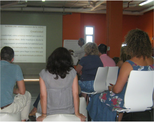 Seminar by Mr. Don Joaquín Moreno representative of the Technology Department at the University of Cadiz. He talked about the importance of management innovation for SMEs belonging to traditional sectors and ended his speech with a workshop on leather and creativity.